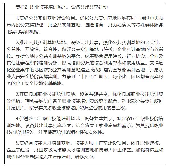 ——坚持共建共享、协同发力。加强对职业技能培训资源的统筹利用,发挥公共实训基地和职业院校(含技工院校,下同)等功能作用,鼓励支持龙头企业、社会资源依法参与职业技能培训,推动共建共享,形成工作合力。