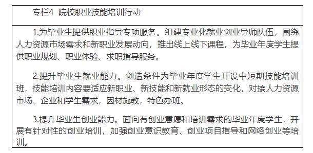 突出职业技术(技工)教育类型特色,深入推进改革创新,扩大技术技能人才培训规模。大力发展技工教育,支持技师学院建设。充分发挥职业院校培训资源优势,提升培训规范化、专业化水平。实施院校职业技能培训行动,动员和支持各类职业院校积极开展职业培训,推行“学历证书+职业技能等级证书”制度,积极为毕业年度学生提供职业技能培训服务并纳入职业培训补贴范畴。符合条件的职业院校可按规定承担政府补贴的职业技能培训任务。支持职业院校强化校企合作,为学生提供全方位技能培训服务。